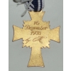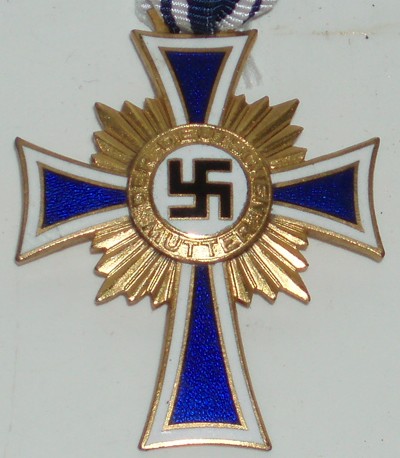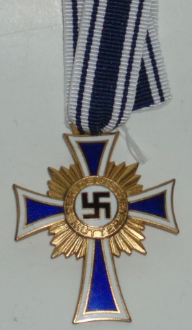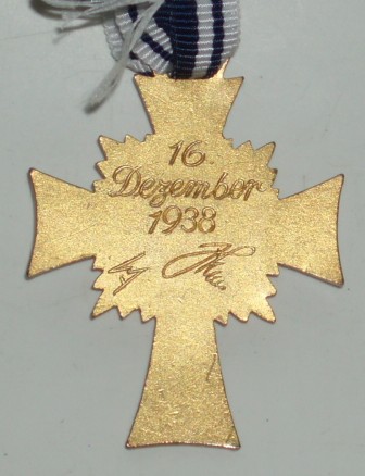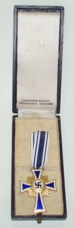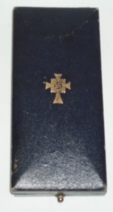 WWII German Mother's Cross, Gold, Cased. Awarded for bearing eight or more children. Second pattern 1939-1944 with inscription, "16 Dezember 1938" with Hitler signature on the reverse. Enamel & finish is excellent, (ribbon is a replacement). In side case lid is marked, "Liefergemeinschaft Pforzheimer Innungen". Very little wear to the case.