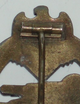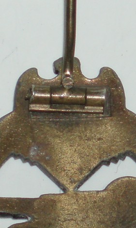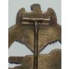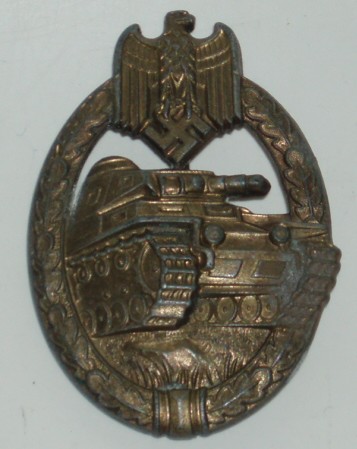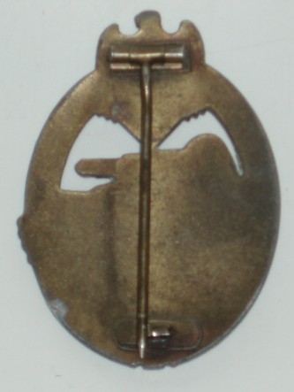 WWII German Panzer Assault Badge, Bronze. Unmarked mold injection manufacture. Has the top catch assemply but missing the lower hook. Has most of the bronze finish with minor wear to the high lights.