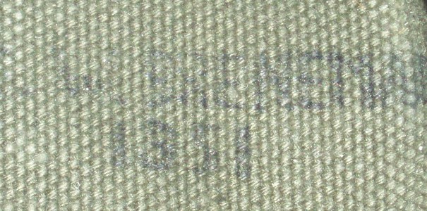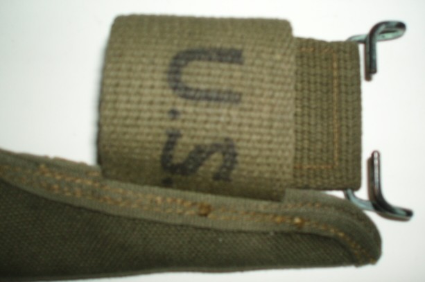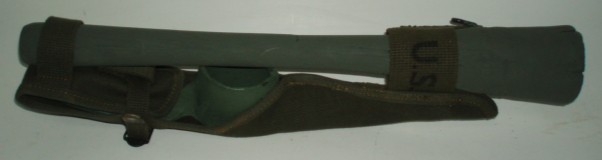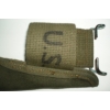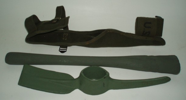 US M1910 Pick-Mattock & Carrier. OD cotton canvas carrier is maker marked & dated 1951. Metal Pick-Mattock & wood handle are painted OD green.
