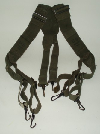 US M1944/45 Equipment Suspenders. OD cotton web construction with blackened metal fittings. Marked: "US, PIONEER, 1951".