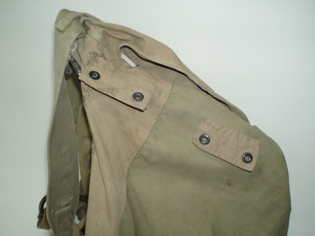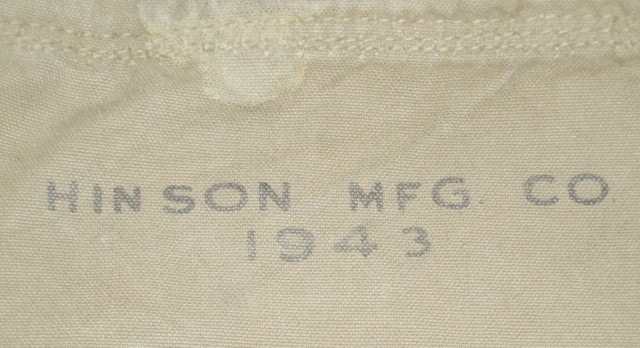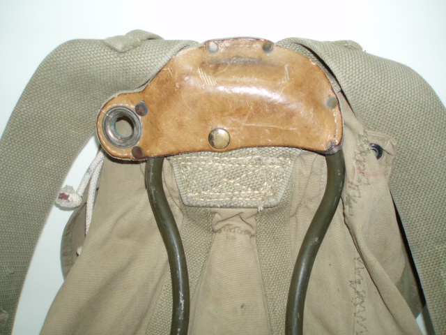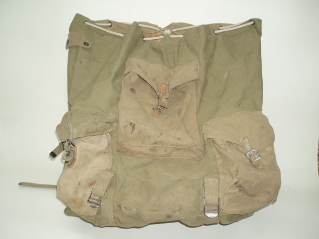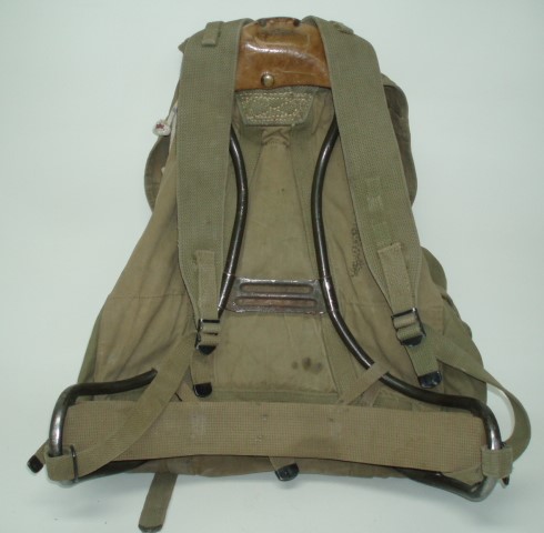 WWII US Bergen Rucksack. Khakie cotton canvas pack with external pockets mounted on a metal frame. Maker marked, "HINSON MFG. CO." & dated 1943. Type issued to Mountian Troops.