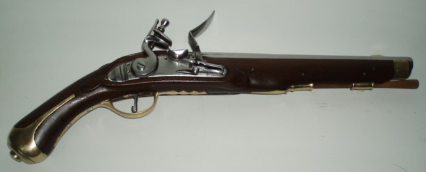French 1733 Cavalry Pistol. Fully functioning unmarked lock with hardened frizzen. Usually issued in pairs as, "a brace". Many were supplied & shipped to North America by the French & used during the War Of Independence.