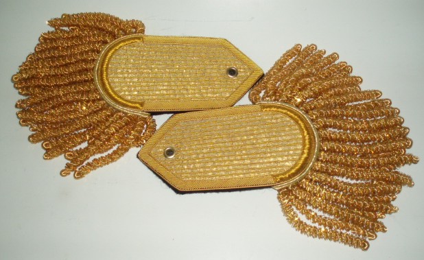 British Epaulettes, Napoleonice Era. Pair of gold bullion epaulettes suitable for a Colonel during the Napoleonic Wars. These have a dark navy blue wool underlay.
